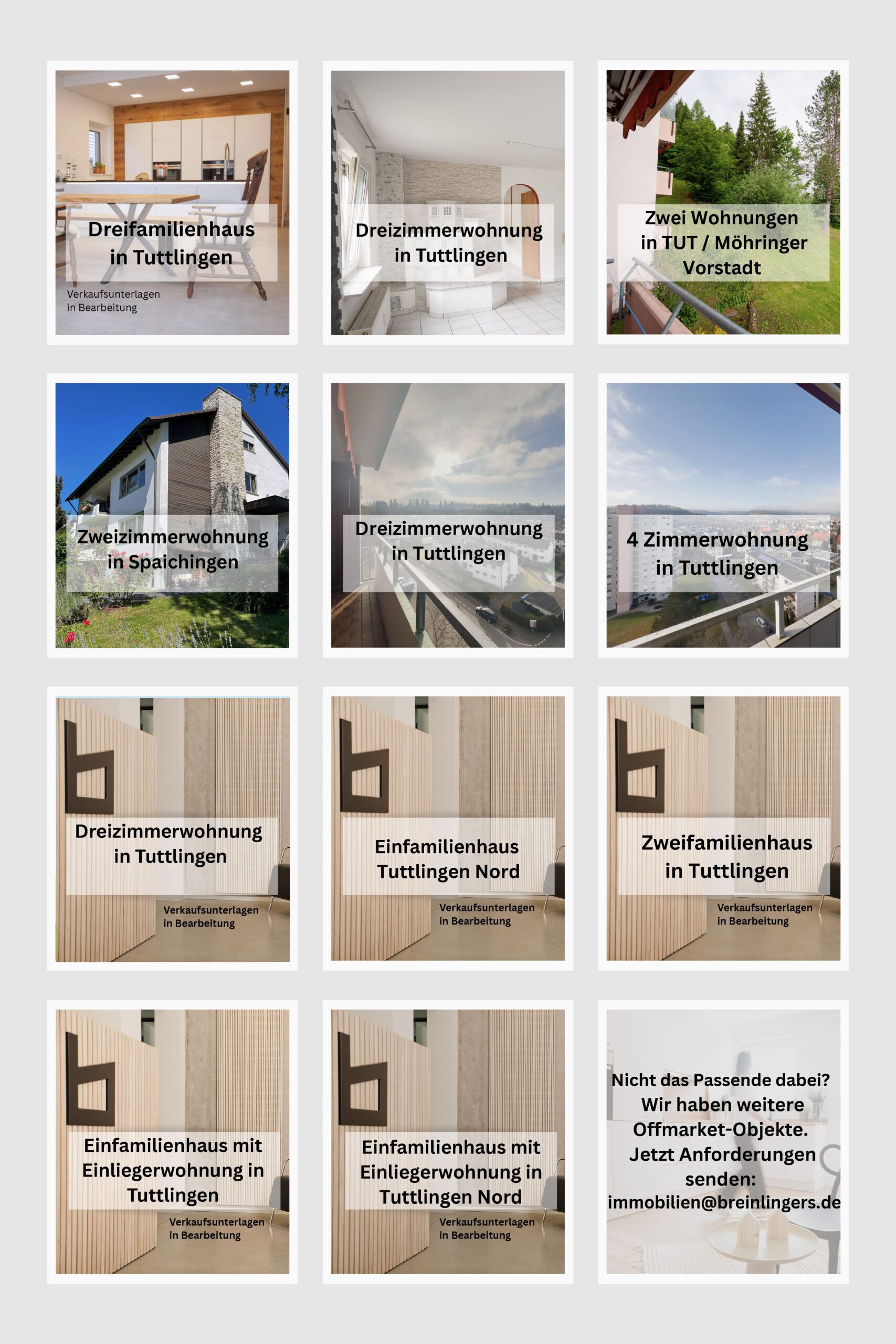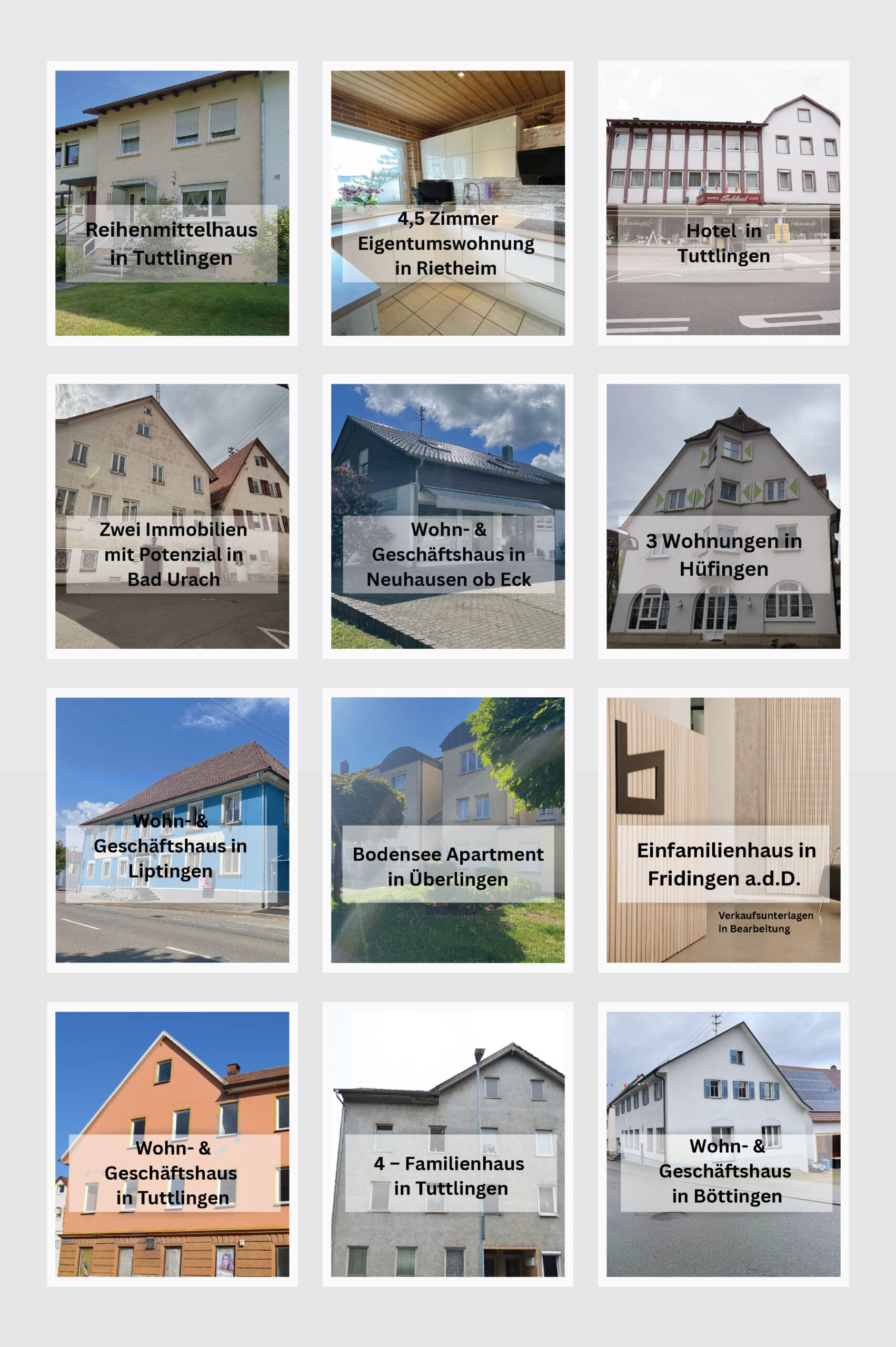 Nachfolgend finden Sie eine Übersicht unserer aktuellen Immobilienangebote in Tuttlingen und der Umgebung. FĂŒr weitere Informationen zu einem Objekte klicken Sie auf das nachfolgende Bild und dann auf das Objekt, welches Sie interessiert.